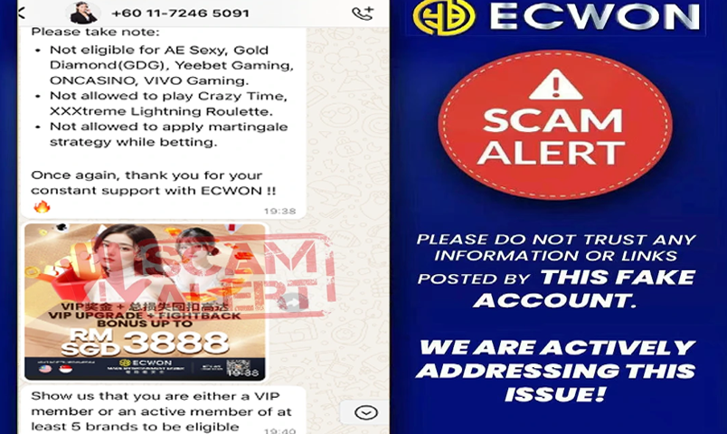 ECWON hereby clarifies that we has no relationship with this Whatsapp Number "601121698954". Before deposit please enter our ECWON official website livechat and get latest online banking account with our 24 hours livechat customer service.